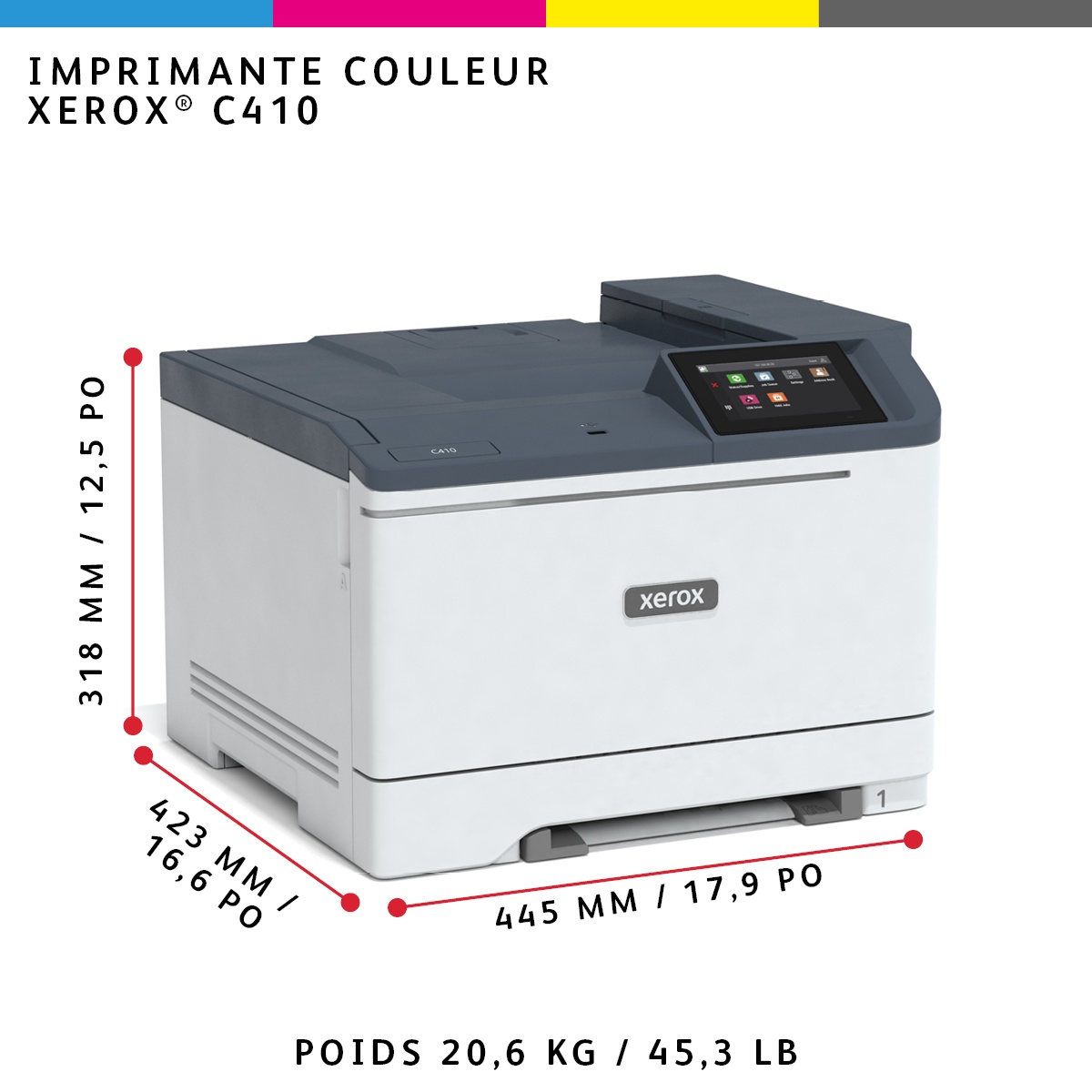 Xerox Imprimante recto verso A4 40 ppm C410, PS3 PCL5e/6, 2 magasins 251 feuilles. Technologie d'impression: Laser, Couleur. Nombre de cartouches d'impression: 4, Cycle de service (Maximum): 125000 pages par mois. Résolution maximale: 1200 x 4800 DPI. Taille de papier de série A ISO maximum: A4. Vitesse d'impression (noir, qualité normale, A4/US Letter): 40 ppm, Impression recto-verso. Écran: LCD, Couleur du produit: Gris, Blanc